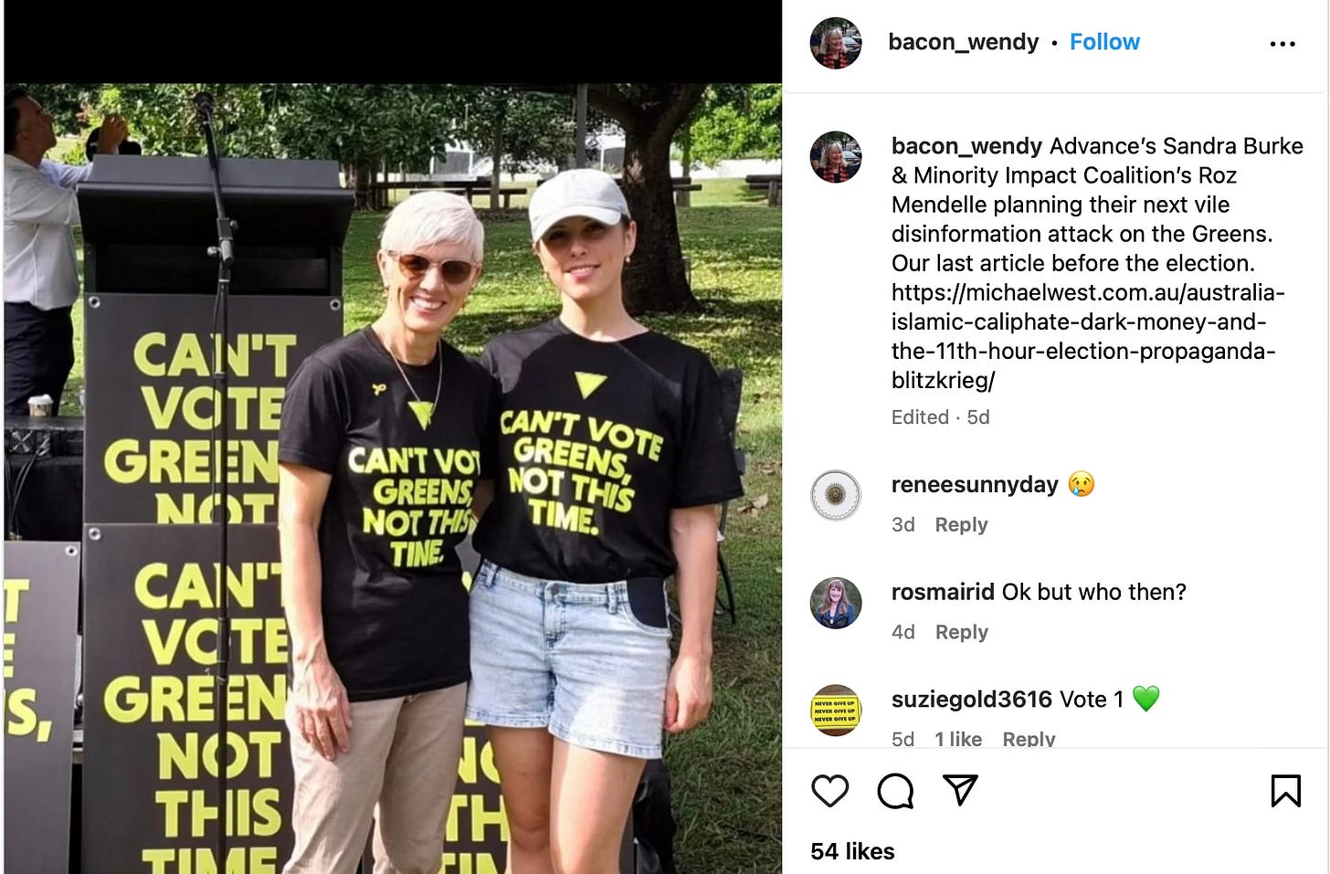 Advance and the AJA have several reasons for welcoming losses of Greens seats in parliament. For the former, this signals fewer politicians to defend climate action and social justice. The AJA rejects politicians supporting a peaceful resolution for Palestine. The work of the front groups suggests both groups to be loosely part of the NatCon project that aims to unite Christian Nationalists, Israeli Jewish Nationalists and Hindu Nationalists against Muslims, against modernity and against climate action. The Iranian monarchists’ role in that coalition is noteworthy.