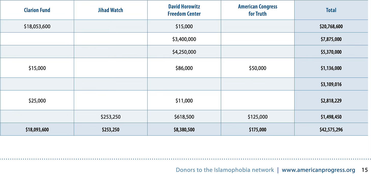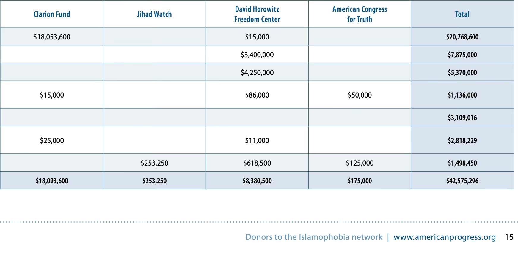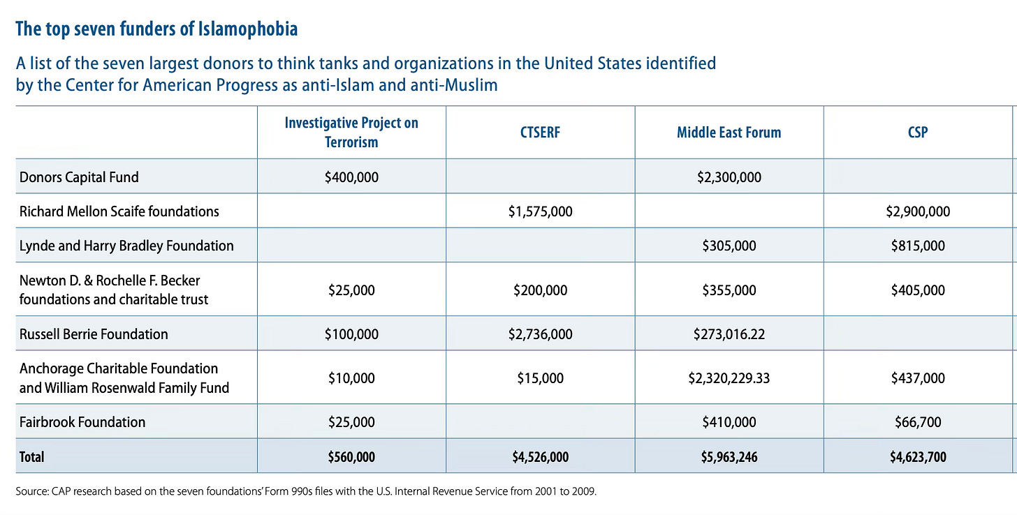 The other faces of the Islamophobia project include Frank Gaffney who founded the neocon Center for Security Policy (CSP) in 1988. It has overlaps with AEI/PNAC personnel with John Bolton, Trump’s erstwhile National Security Advisor, in all three. Richard Perle is another. It has had longterm funding from many notable weapons manufacturers. Another face is Steven Emerson (Investigative Project on Terrorism 1955). Both men have been mainstreamed into American government agency advisory roles despite their anti-Muslim work being largely discredited. Another activist body that fosters people brought in to advise on government policy is the Clarion Project.