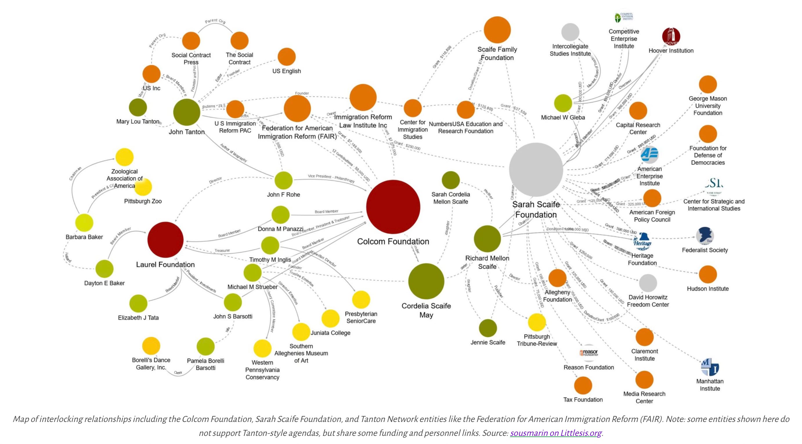 The Tanton Network has connections with the more extreme organisations of the white supremacist sphere such as Jared Taylor and his New Century Foundation. Ahmed asserts that Taylor was also on the board of far right Richard Spencer’s National Policy Institute. It should be noted for the purposes of this discussion that antisemitic material is found in both Tanton Network and the more overt groups’ publications. Tanton also brought Peter Brimelow “into the nativist fold.” His VDare site contributor list is “a Rolodex of the most prominent pseudo-intellectual racists and anti-Semites.” Brimelow was noted for reporting directly to Rupert Murdoch at Fox News.