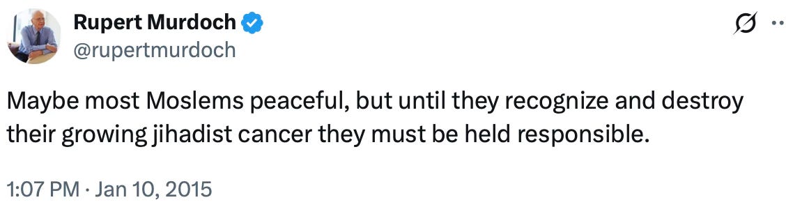 Rupert Murdoch’s News Corp is one. Murdoch owns the country’s only national broadsheet, and it has platformed Middle East Forum’s Daniel Pipes approximately 80 times since 2001. Rupert Murdoch is reported to have worked personally with Tanton Network-affiliated Peter Brimelow. Another of Murdoch’s controversial contacts is his erstwhile speechwriter, Michael Anton, senior at the radicalised Atlas partner the Claremont Institute. That body has been described as becoming a “racist fever swamp.” There is constant pro-Israel messaging in Murdoch’s platforms, and considerable hostility towards Islam. A 2017 study found that Murdoch’s Australian mastheads targeted Islam and Muslims on average eight times per day.