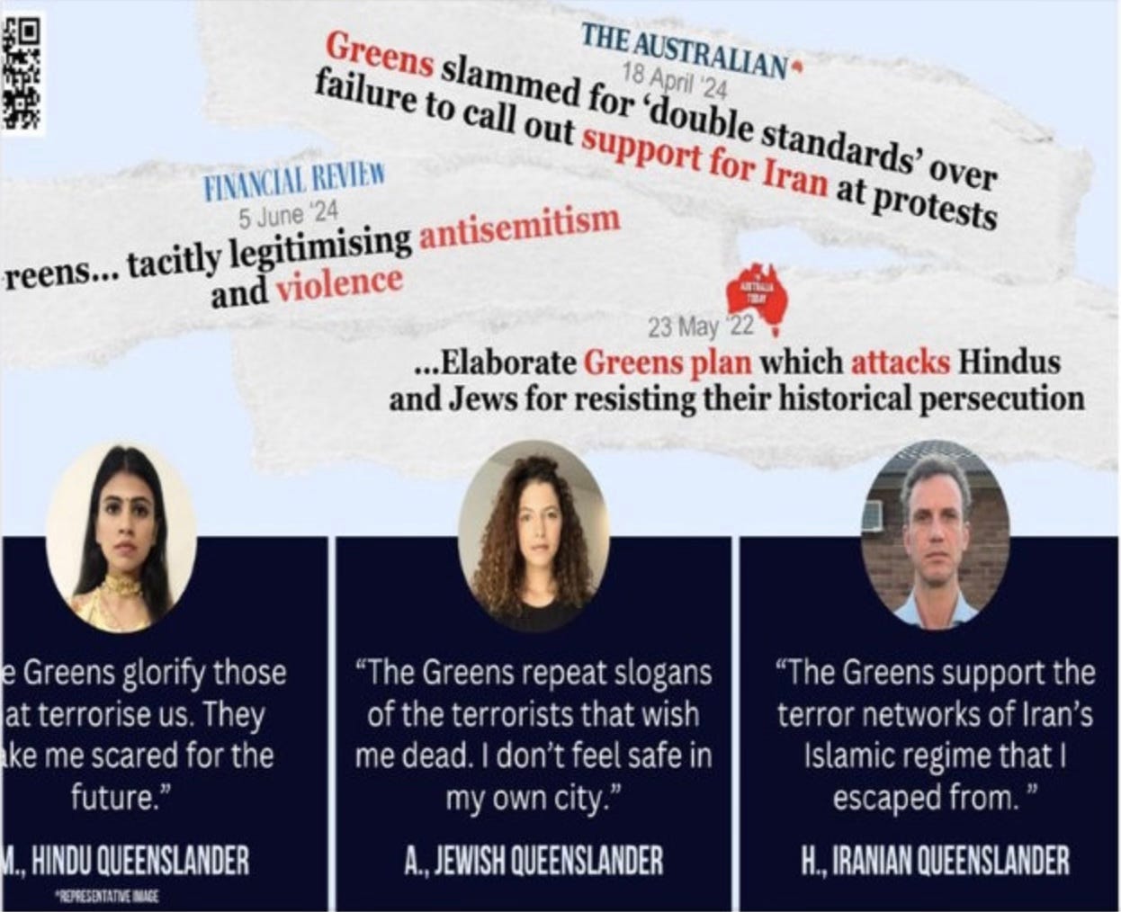The image features three individuals targeting the Greens as a “divisive hate group” for the represented ethnicities or cultural identities. One of the three is posed as representing a “Jewish Queenslander” who doesn’t feel safe in her own cities because of Greens repeating “slogans of the terrorists that wish [her] dead.”
