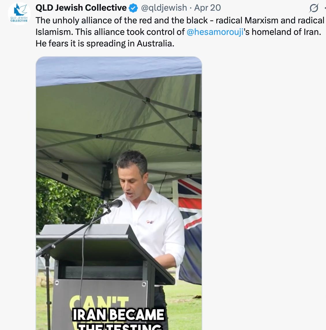 The Iran Novin Party is “Pahlavist.” That is, they support the Pahlavi family to replace the Iranian Islamist regime. The QJC site claims that the Greens “support the Iranian regime’s terror proxies.” This is, of course, nonsense. (The MIC site also targets Labor for not attacking these groups’ issues aggressively enough.)